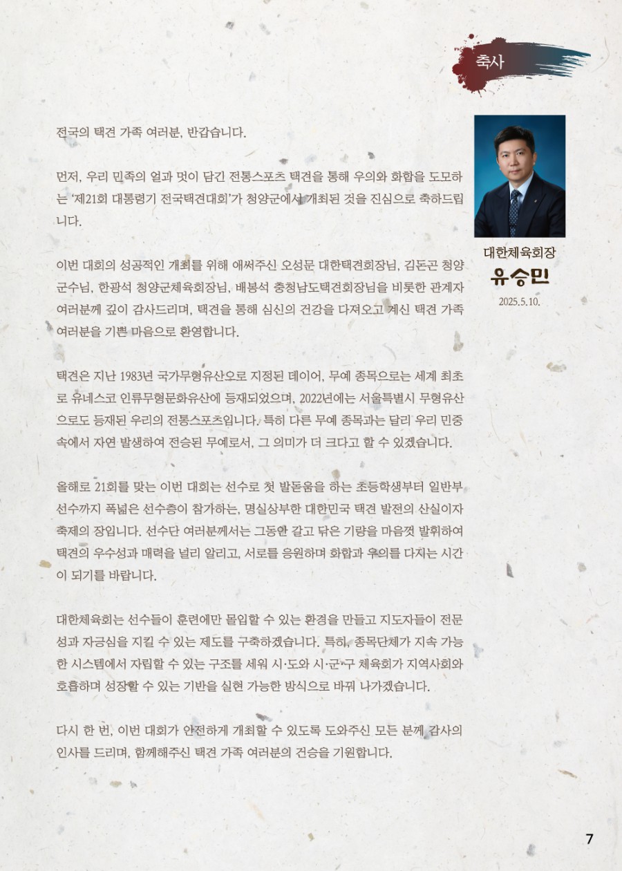 제21회 대통령기 전국택견대회 <카다로그> 페이지 정보 작성자 대한택견회 작성일25-05-09 18:51 조회1,094회 댓글0건 이전글 다음글 목록 본문 댓글목록 등록된 댓글이 없습니다. 이전글 다음글 목록